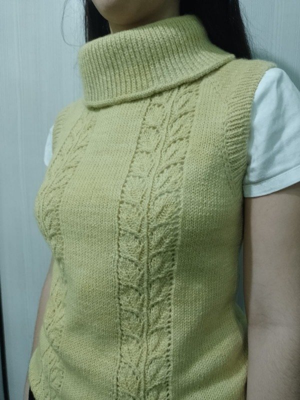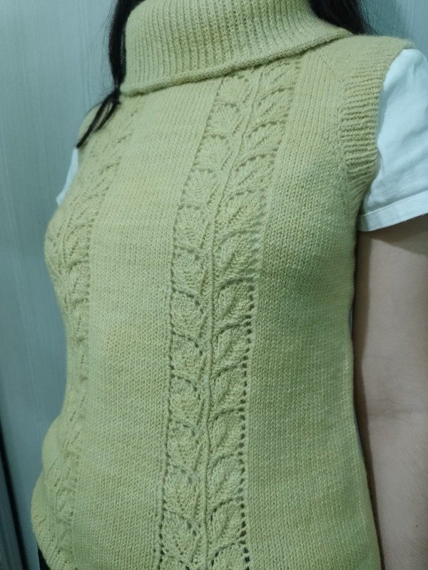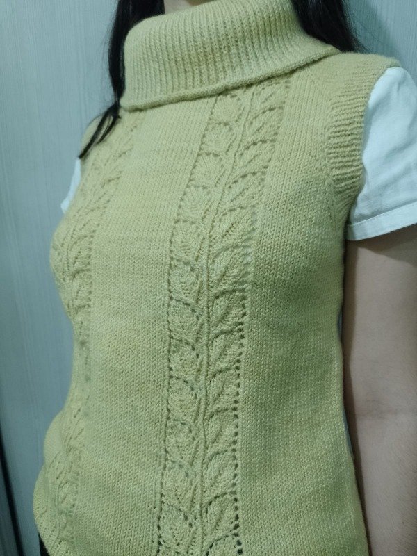 Este patrón es para tejer un chaleco, muy abrigado y elegante. Mi inspiración para esta prenda la encontré en mi hija, que ama las prendas con cuellos abrigados, y el cuello en esta prenda es el protagonista indiscutido! El otoño es mi estación del año preferida y por eso necesitaba incluir un delicado detalle en el frente, una hermosa guarda de hojas, que da nombre al diseño!